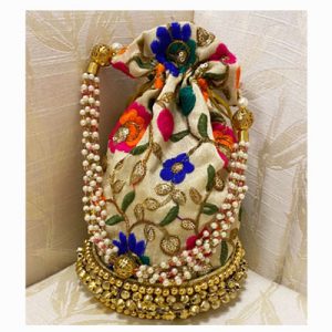 This embroidered pouch interspersed with multi colored flowers is a perfect accessory for any Indian outfit. Handles made with white beads adds to its beauty. What makes it standout is the stable base made of a gold ring with gold metal beads which is missing in ordinary pouches
